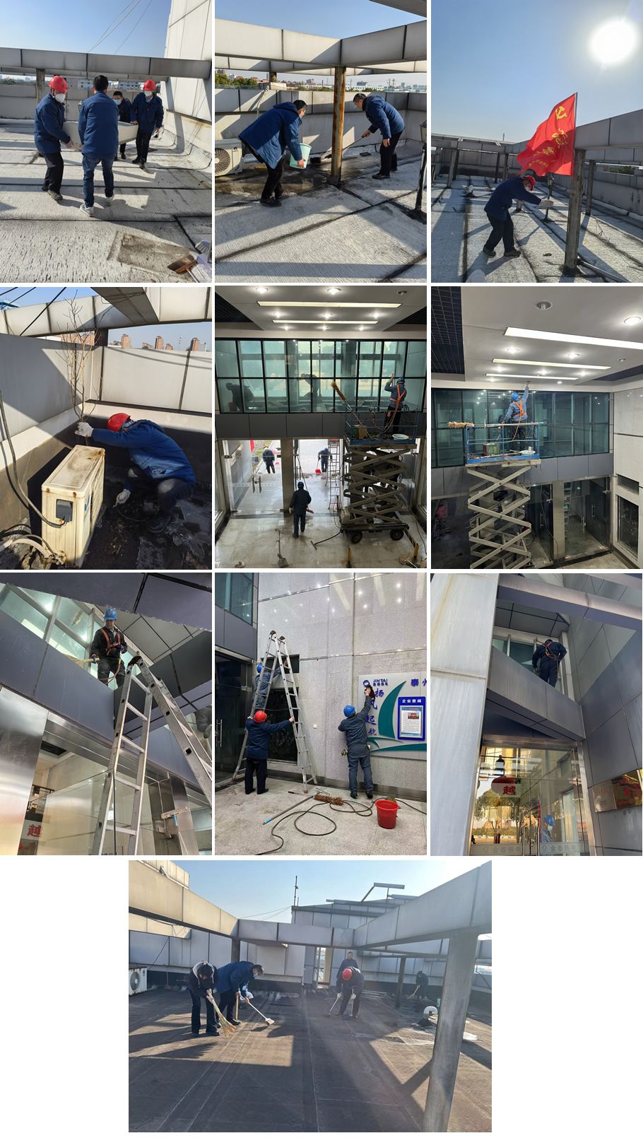 1月17日行政党小组在在行政楼三楼、四楼露台,铲土扫地、冲刷清洗、消除漏点、清理4台废旧空调室外机;机务检修杨书忠、陈群利用电动升降梯,将大厅外钢结构除锈、油漆,陈爱军焊接美观实用的灯笼挂钩------大家团结一心,分工合作。